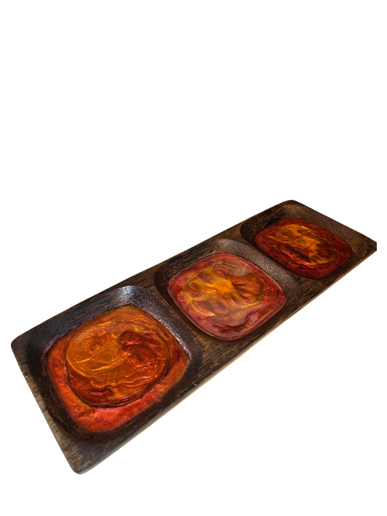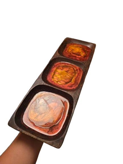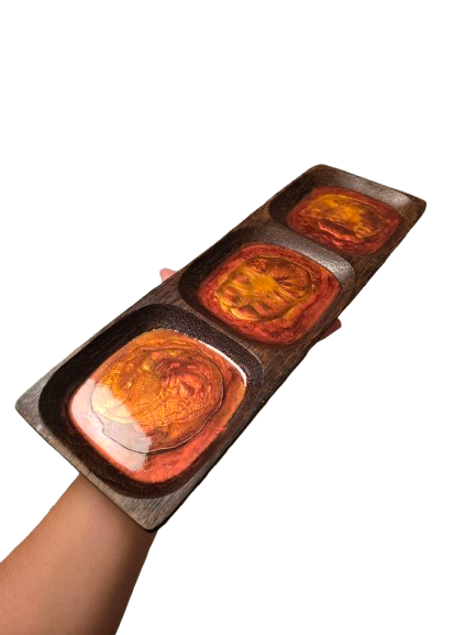 Bois de coco naturel et résine rouge-dorée se rencontrent pour capturer la magie d’un crépuscule tropical.